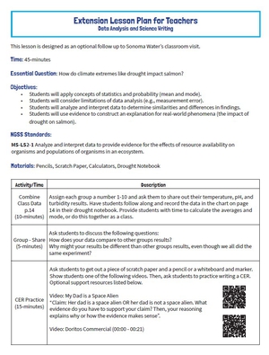 Take your students beyond the basics by extending the lesson into a focused exploration of Claim, Evidence, and Reasoning (CER). This extension builds on the Drought Lesson Notebook and the whole-class data table, offering opportunities to calculate averages and modes, spark group discussions, and reflect on the significance of their findings. Linked videos provide additional practice in CER, helping students sharpen their ability to organize ideas, think critically, and draw well-supported conclusions.